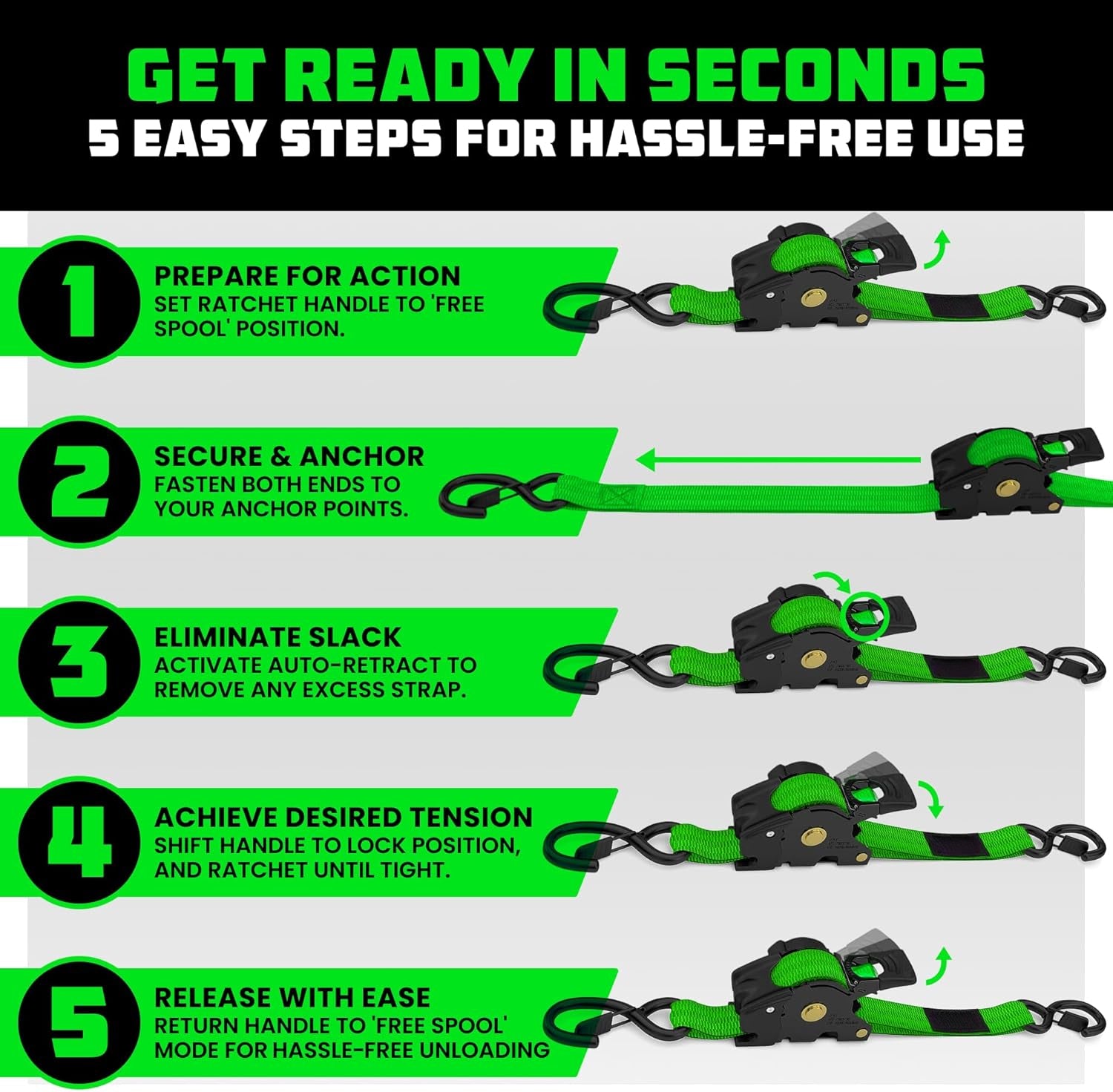 You’re buying speed, cleanliness, and control — a strap that locks down your load and instantly resets itself for the next run.